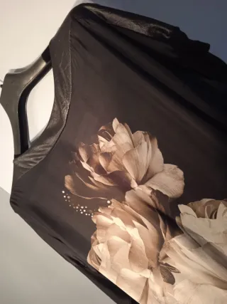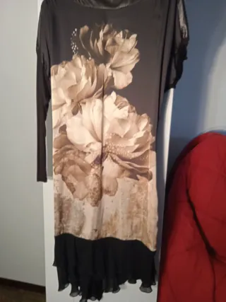 Elegante abito in maglina con una bellissima fantasia floreale. - Fantasia con fiori nei toni del marrone e beige. - Fondo con balza in tessuto nero. - Maniche lunghe.