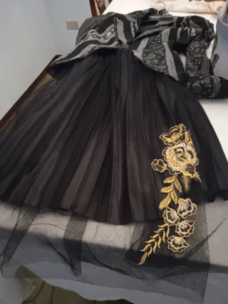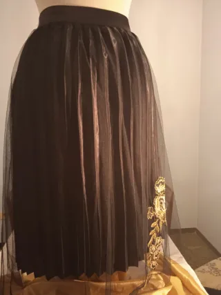 Elegante gonna lunga in tulle nero con dettagli ricamati color oro. La gonna presenta una gonna interna in raso lucido e un design plissettato. - Tessuto esterno in tulle trasparente. - Dettagli floreali ricamati sul lato. - Finitura a pieghe. - Sottogonna in raso.