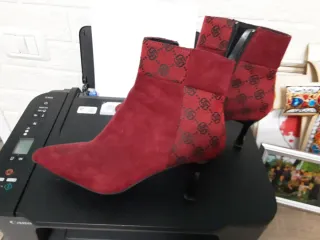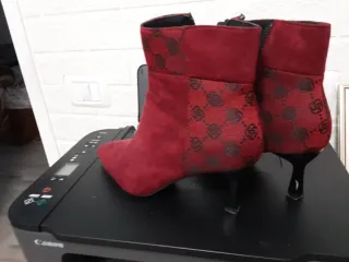 Eleganti stivaletti rossi con un motivo decorativo. - Materiale scamosciato - Tacco a spillo - Punta affusolata - Fantasia geometrica tono su tono