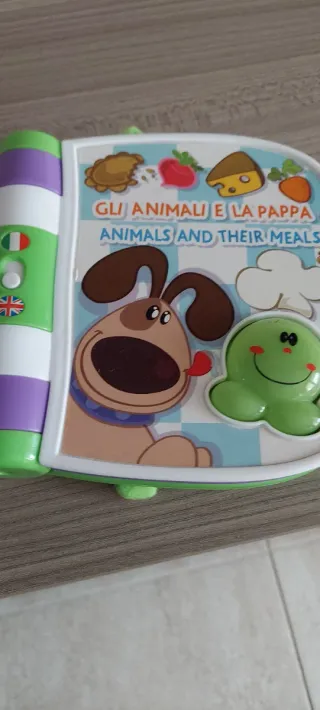 Libro sonoro Chicco intitolato "Gli Animali e la Pappa (Animals and their meals)" - Copertina colorata con illustrazioni di animali e cibo. - Pulsanti interattivi sul lato sinistro. Presente tasto per scelta della lingua fra Italiano e Inglese