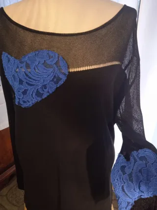 Elegante maglia nera in filato di viscosa e poliammide ( effetto semi lucido) con inserti azzurro oltremare a forma di cuore . Misure : da bordo manica a bordo manica 165 cm, Lunghezza maglia 78 cm, Giro ascelle 108 cm - Tessuto in viscosa e poliammide. - Inserti in pizzo blu. - Maniche lunghe. Comprata a Madrid outlet Paloma Wool, poi tolto etichetta perché dava fastidio