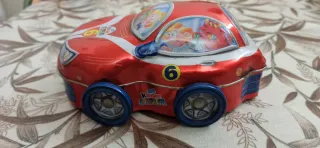 Macchinina di latta a tema Kinder Sorpresa, con i personaggi Angelino e Satanello. - Design a forma di auto sportiva. - Colore rosso brillante con dettagli bianchi e blu. - Illustrazioni dei personaggi sui finestrini. - Numero 6 in evidenza sul cofano. Presenta 2 abrasioni visibili nelle ultime 2 foto.