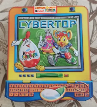 Originale contenitore in latta a forma di computer portatile Cybertop Kinder Sorpresa. - Design colorato con personaggi Kinder. - Chiusura a cerniera. - Ideale per collezionisti o come portaoggetti.
