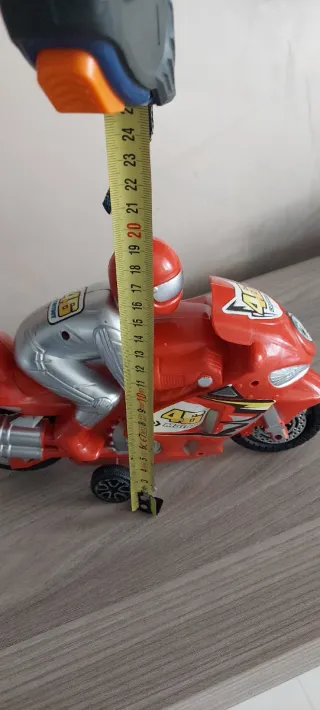 Moto giocattolo di colore rosso con pilota. Ideale per collezionisti o per bimbi che amano giocare con i veicoli. Il tuo bambino sarà felice di ricevere in regalo questa moto in quanto non troppo piccola, molto colorata e sempre "in piedi", grazie alle rotelle che gli consentono anche di muoversi sulla spinta ricevuta.