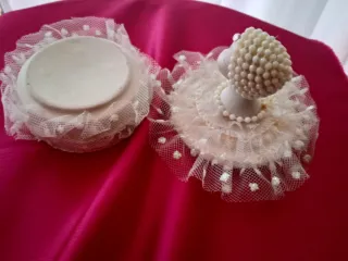 Vasetto vintage, risalente agli anni '60. Perfetto per conservare piccoli oggetti preziosi. - Decorato con perline e strass. - Abito in pizzo e tulle. - Testa in ceramica dipinta a mano.