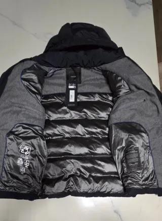 Capospalla dal design essenziale, caratterizzato da una fodera interna trapuntata di colore marrone e dettagli distintivi come le coulisse del colletto a righe bianche, rosse e blu. * Materiale: L'esterno è realizzato in tessuto tecnico resistente, mentre la fodera interna è in poliestere e viscosa, garantendo comfort e una leggera imbottitura termica grazie alla trapuntatura interna. * Design: Presenta una chiusura frontale con zip metallica, collo alto con coulisse regolabili e tasche laterali con zip. * Stile: È un giubbotto versatile da mezza stagione, adatto a un look casual ma curato.
