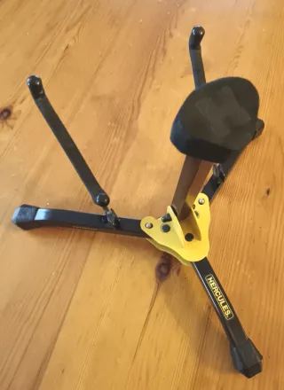 Supporto per chitarra acustica HERCULES. - Modello GS402B. - Struttura pieghevole e compatta. - Bracci rivestiti per proteggere lo strumento. - Supporto superiore imbottito.
