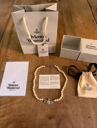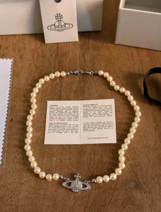 Collana Vivienne Westwood con perle e ciondolo Orb argentato. Originale al 100%. Chiusura con moschettone, lunghezza 42 cm.