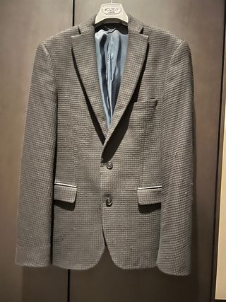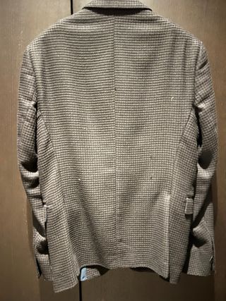 Elegante giacca da uomo Zara. - Tessuto a trama quadrettata. - Chiusura a due bottoni. - Tasche frontali con patta. - Fodera interna blu.