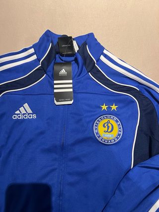Completo sportivo Adidas composto da 3 pezzi, con logo Dinamo Kiev.con cartellino - Tuta da ginnastica blu. - Pantaloni con strisce bianche. - Giacca con strisce bianche e dettagli blu scuro.