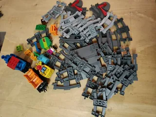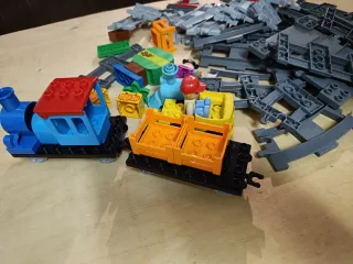 Set treno con tantissimi binari e accessori Lego Duplo. Più di 30 pezzi di binario, locomotiva e vagone (non elettrici), un veicolo e due personaggi. Tutto originale. Venduto per inutilizzo, tutto in buone condizioni.