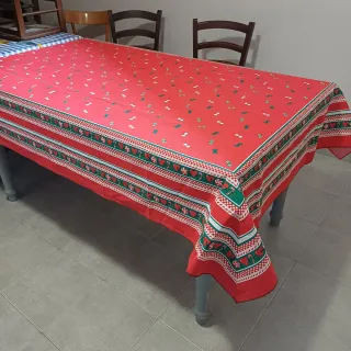 Tovaglia per le feste con un allegro motivo a tema natalizio. - Fantasia con fiocchi e caramelle. - Bordi decorati con cuori e motivi natalizi. - Ideale per creare un'atmosfera festosa. 8 tovaglioli invlusi