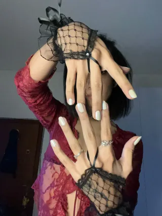 Accessori in pizzo per un tocco di eleganza. - Guanti corti in pizzo nero con fiocchi. - Dettagli in pizzo rosso sul top.