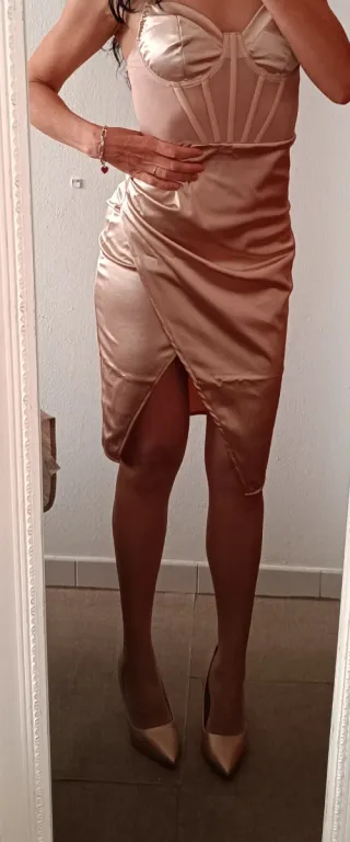 Vestito da donna in tessuto satinato color beige satinato. Un capo elegante e raffinato. - Tessuto setosa elasticizzato. - Design con corpetto strutturato, corsetto. - Gonna drappeggiata con spacco.