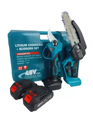 Set composto da una motosega e una forbice elettrica, entrambi alimentati da batterie al litio da 48VF. - Motosega con lama da 6 pollici. - Forbice per potatura. - Due batterie al litio incluse. - Accessori inclusi: flacone olio, pietra per affilare, chiave a brugola e cacciavite.