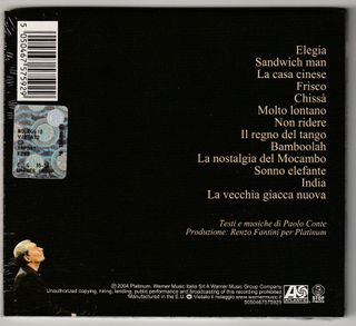 CD Originale, Nuovo e Sigillato in Confezione Digipack Paolo Conte. Elegia (2004) Distribuzione : Platinum / Warner Music (2004) Barcode : 5050467575929 Track listing CD : 1.Elegia 2.Sandwich Man 3.La Casa Cinese 4.Frisco 5.Chissá 6.Molto Lontano 7.Non Ridere 8.Il Regno Del Tango 9.Bamboolah 10.La Nostalgia Del Mocambo 11.Sonno Elefante 12.India 13.La Vecchia Giacco Nuova