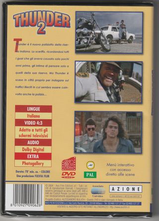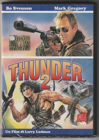 Film d'azione Thunder 2 con Bo Svenson e Mark Gregory, nuovo e sigillato. - Copertina con i protagonisti. - Titolo Thunder 2 in rilievo. DVD Originale, Nuovo e Sigillato Thunder II (1986) Supporto: DVD Genere: Azione Regia : Larry Ludman Cast : Bo Svenson, Mark Gregory, Raimund Harmstorf Durata : 78 minuti c.a. Formato : 4:3 Lingua : Italiano 2.0 Sottotitoli : \ Region Code : Pal 0 Contenuti Extra : Photogallery Distribuzione : Avo Film (2004) Barcode : 8010927090628
