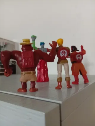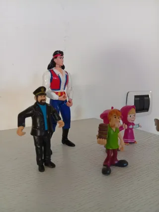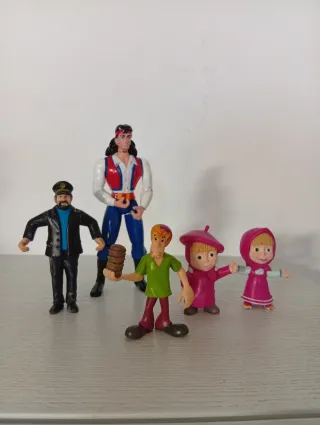 Set di action figure con diversi personaggi. - Action figure di un uomo con giacca nera e cappello. - Action figure di un uomo con gilet rosso e fascia. - Action figure di Shaggy. - Due action figure di bambine con cappotto rosa.