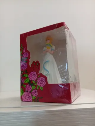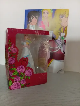 Statua di Lady Oscar con un elegante abito da ballo, decorata con rose. - Dettagli floreali sul bordo della scatola. - La figura è protetta da una confezione trasparente.