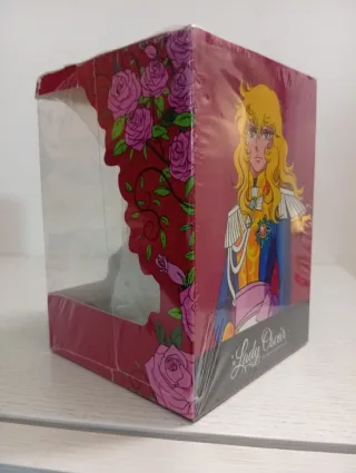 Scatola con figura di Lady Oscar, decorata con rose. - Scatola rossa con disegno di rose. - Figura di Lady Oscar con ventaglio.