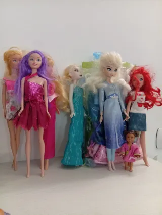 Lotto di bambole Barbie con numerosi accessori. - Include bambole Barbie principale. - Oltre 25 vestiti e accessori per Barbie. - Diverse bambole aggiuntive presenti.