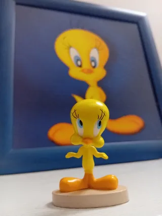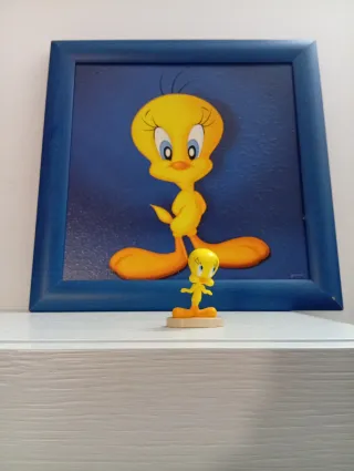 Set composto da una statuetta del personaggio Titti e un quadro. - Statuetta di Titti in plastica gialla. - Quadro con Titti sullo sfondo blu.