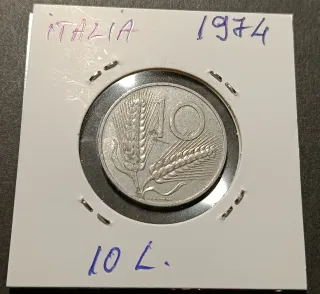Moneta da 10 Lire italiane del 1974. - Dritto: Spighe di grano. - Rovescio: Figura allegorica. - Valore nominale: 10 Lire. - Anno di coniazione: 1974.