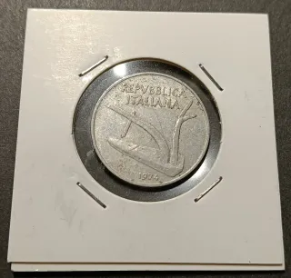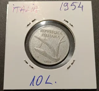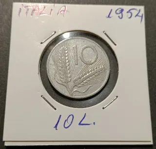 Moneta da 10 Lire della Repubblica Italiana, coniata nel 1954. - Dritto: Spighe di grano. - Rovescio: Valore nominale 10 e L. - Anno: 1954.