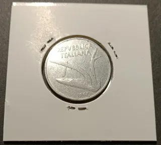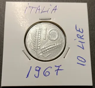 Moneta da 10 Lire italiane del 1967. - Dritto: Spighe di grano. - Rovescio: Figura allegorica. - Zecca: Roma.