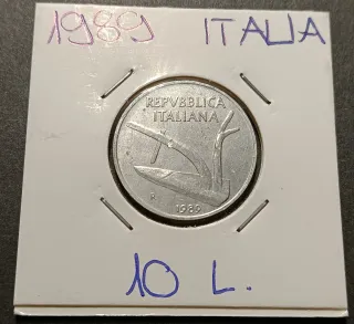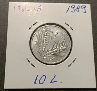 Moneta da 10 Lire italiane coniata nel 1989. - Dritto: Spighe di grano. - Rovescio: La scritta ITALIA e l'anno di coniazione. - Valore nominale: 10 Lire.