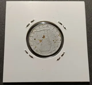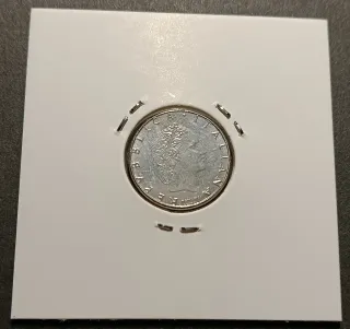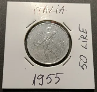 Moneta da 50 Lire della Repubblica Italiana, coniata nel 1955. - Dritto: Figura di un atleta che colpisce un'incudine. - Rovescio: Stemma della Repubblica Italiana. - Valore nominale: 50 Lire. - Anno di coniazione: 1955.