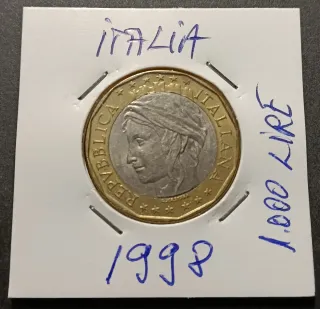 Moneta da 1000 Lire della Repubblica Italiana. - Anno di conio: 1998 - Valore: 1000 Lire - Dritto: Ritratto di dama - Rovescio: Quadro - Materiale: Bimetallico