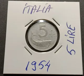 Moneta da 5 Lire italiane del 1954. - Dritto: Ritratto di donna con corona di spighe. - Rovescio: Delfino. - Anno: 1954 - Valore: 5 Lire