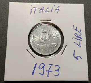 Moneta da 5 Lire italiane del 1973. - Raffigura un delfino. - Anno di conio: 1973. - Paese: Italia.