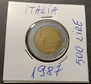 Moneta da 500 Lire italiane coniata nel 1987. - Dritto: raffigurazione di un monumento. - Rovescio: spighe di grano e valore nominale. - Anno di coniazione: 1987.