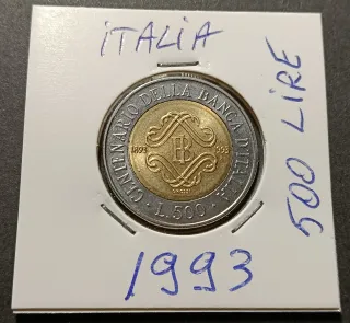 Moneta commemorativa da 500 Lire italiane del 1993. - Dritto: CENTENARIO DELLA BANCA D'ITALIA 1893-1993 - Rovescio: L. 500 - Design con simbolo della Banca d'Italia.