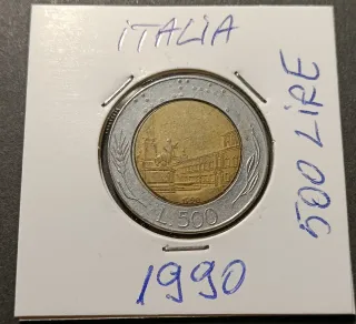 Moneta da 500 Lire italiane coniata nel 1990. - Dritto: raffigurazione di un monumento. - Rovescio: spighe di grano e valore nominale. - Anno di coniazione: 1990.
