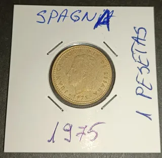 Moneta da 1 peseta spagnola del 1975. - Dritto: Ritratto di Juan Carlos I. - Rovescio: Stemma di Spagna. - Anno: 1975.