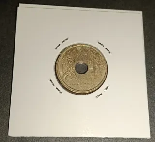 Moneta da 25 pesetas spagnole del 1996. - Dritto: raffigurazione di un castello. - Rovescio: valore nominale e anno di conio.