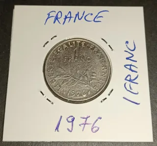 Moneta da 1 Franco francese del 1976. - Dritto: LIBERTE EGALITE FRATERNITE con ramo di alloro. - Rovescio: Valore 1 FRANC e anno 1976.