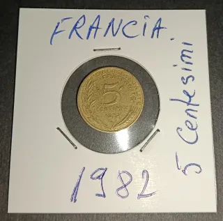 Moneta da 5 centesimi di Franco Francese, coniata nel 1982. - Dritto: Liberté Égalité Fraternité con ramo di alloro. - Rovescio: Valore 5 CENTIMES e anno 1982.
