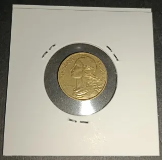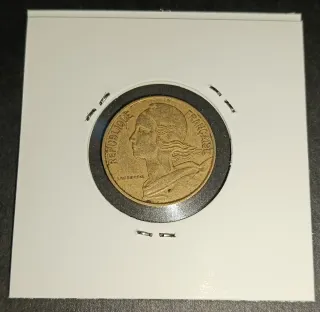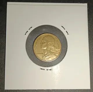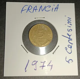 Moneta da 5 centesimi di Franco Francese, anno 1974. - Dritto: Raffigurazione di Marianne con corona di alloro. - Rovescio: Valore nominale 5 CENTIMES e anno 1974, con spighe di grano ai lati.