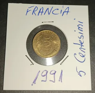 Moneta da 5 centesimi di Franco Francese, anno 1991. - Dritto: Libertè Egalitè Fraternitè con ramo di alloro. - Rovescio: Valore 5 e anno 1991 con ramo di quercia.