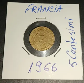 Moneta da 5 centesimi di Franco Francese, coniata nel 1966. - Dritto: Ramo di alloro. - Rovescio: Valore 5 CENTIMES e anno 1966.