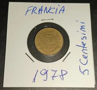 Moneta da 5 centesimi di Franco Francese, anno 1978. - Dritto: Raffigurazione di una spiga di grano. - Rovescio: Valore nominale 5 CENTIMES e anno 1978.