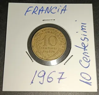 Moneta da 10 centesimi di Franco Francese, anno 1967. - Dritto: LIBERTE • FRATERNITE • EGALITE con il valore 10 CENTIMES e l'anno 1967. - Rovescio: Spighe di grano.