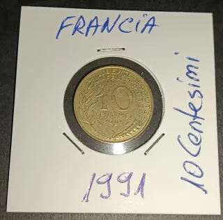 Moneta da 10 centesimi di Franco Francese, anno 1991. - Dritto: Liberté Égalité Fraternité con ramo di alloro e spiga. - Rovescio: Valore 10 CENTIMES e anno 1991 con ramo di quercia.