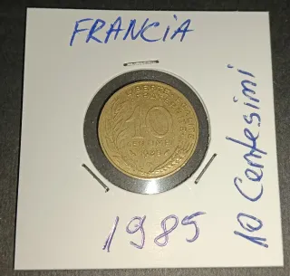 Moneta da 10 centesimi di Franco Francese. - Anno di conio: 1985. - Dritto: LIBERTE EGALITE FRATERNITE con ramo di alloro. - Rovescio: Valore 10 CENTIMES e ramo di quercia.