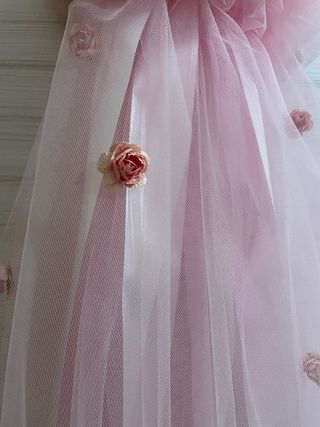 Fiocco nascita realizzato in tulle rosa con applicazioni di rose. - Decorato con piccoli fiori. - Nastri in raso rosa. - Lunghezza 100cm