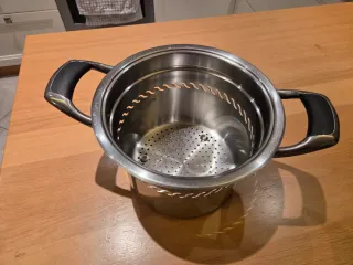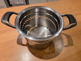 Cestello scolapasta per pentola AMC in acciaio inox con cestello forato, ideale per cuocere la pasta ed estrarla senza dover buttare l'acqua di cottura. Per pentole di diametro di 20 centimetri. Ottime condizioni. - Manici in plastica per una presa sicura. - Design moderno e funzionale.